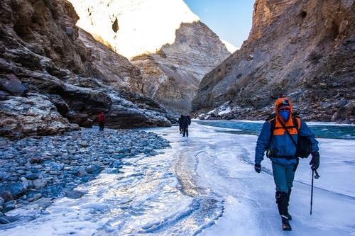 On the way, you can meet a lot of locals wearing their traditional woollen Gonchas - some of them monks who are hiking from the Lingshed Monastery to Leh, some of them young students accompanied by their parents returning to their schools in Leh after the winter vacation. Watching the locals negotiate the Chadar is a fascinating sight. They are suitably adept to the climate and seem very much at home in the sub-zero temperature and the biting cold winds. Nothing wipes the smiles off their faces and dampens the warmth of their spirit.
